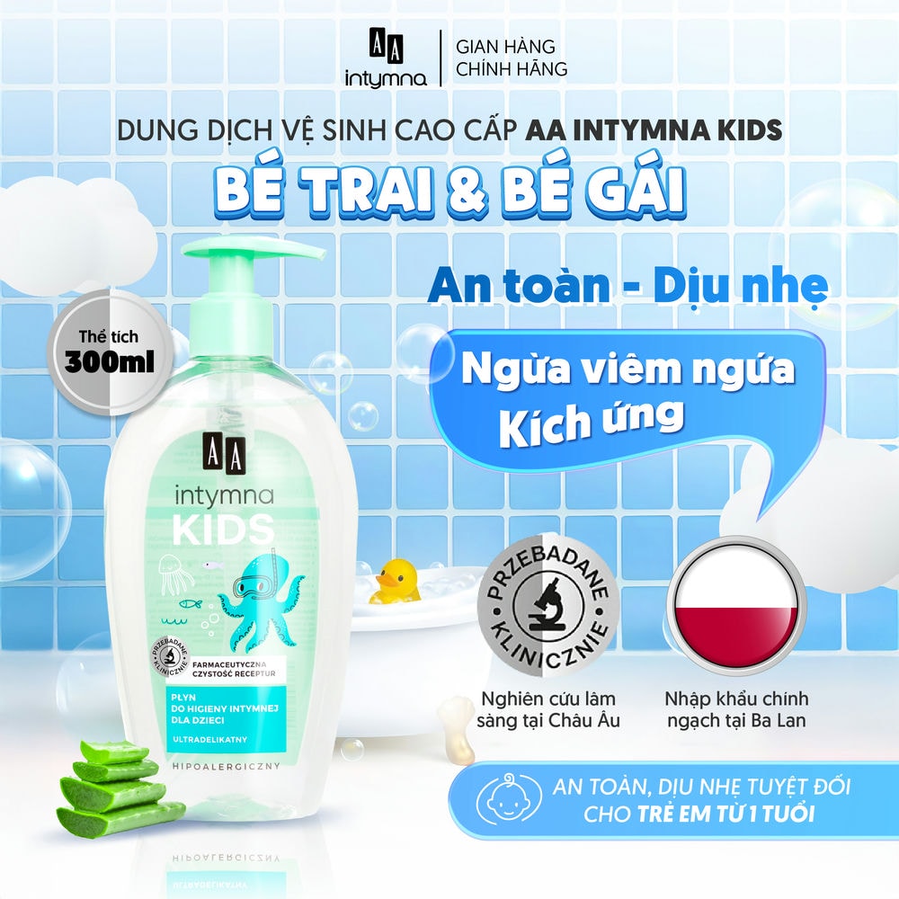 Dung dịch vệ sinh cao cấp AA Intymna Kids được thiết kế theo tiêu chuẩn dược phẩm Châu Âu dành cho trẻ từ 1 tuổi. Sản phẩm đã được kiểm nghiệm da liễu bởi bác sĩ Nhi khoa và Da liễu tại Châu Âu, không gây dị ứng, cực kỳ dịu nhẹ với làn da mỏng manh của bé. Công thức nổi bật với Lactic Acid giúp duy trì và cân bằng hệ sinh thái da, kết hợp BỘ ĐÔI HOẠT CHẤT LÀM SẠCH THẾ HỆ MỚI Lauryl Glucoside và Coco-Glucoside cùng phức hợp dưỡng ẩm & làm dịu tự nhiên gồm Lô hội, Panthenol, Allantoin và Sodium Hyaluronate. Nhờ đó, AA Intymna Kids tạo lớp bọt mềm mịn, nhẹ nhàng làm sạch, cấp ẩm và phục hồi vùng da nhạy cảm khi bị kích ứng.